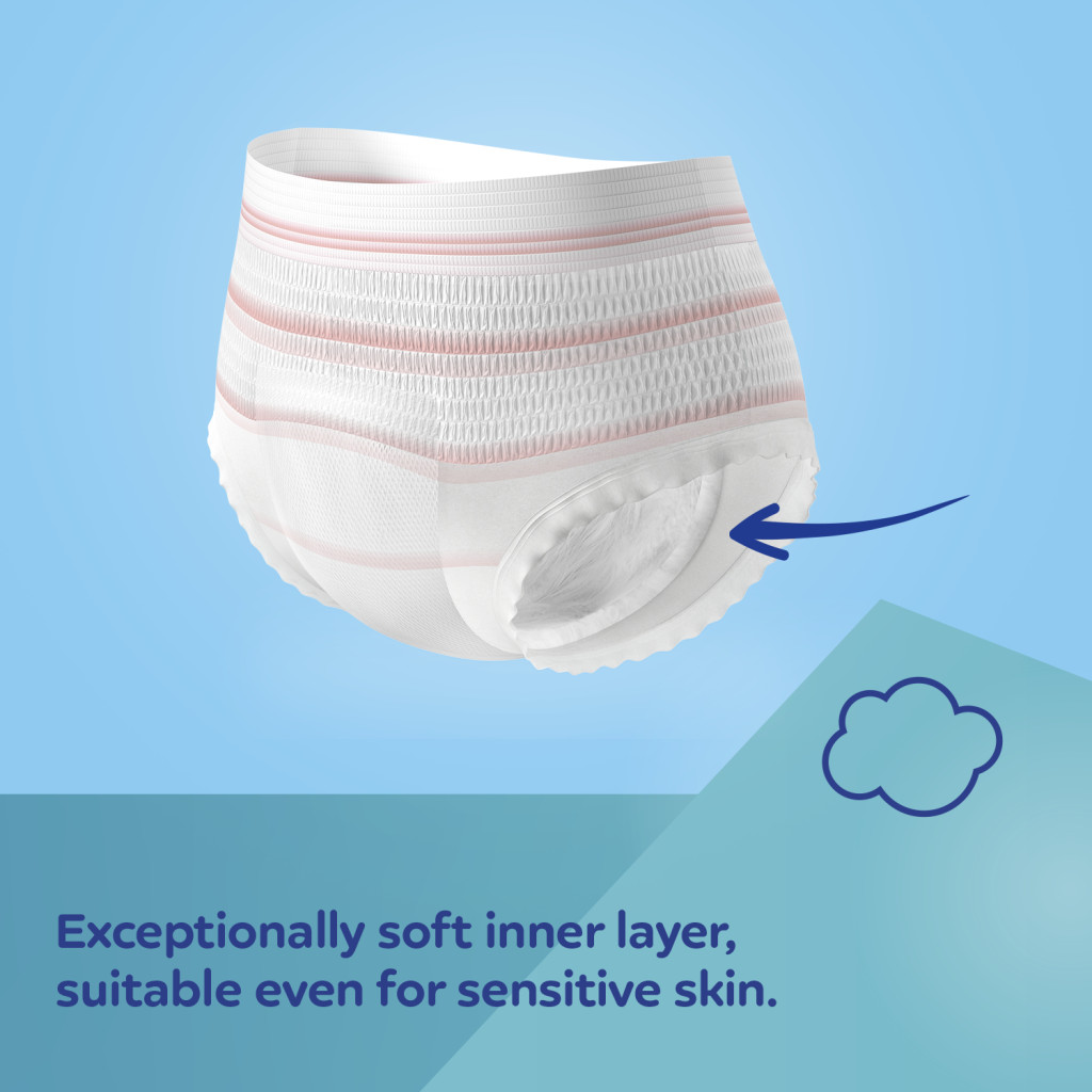 A pelenka akár 400 ml folyadékot is képes felszívni, így hosszan tartó száraz érzetet biztosít. A 360°-os szivárgás elleni védelem teljes körű biztonságot nyújt minden testhelyzetben, akár fekve is. Légáteresztő kialakításának köszönhetően a bőr szabadon lélegezhet, így csökken az irritáció kockázata, míg a különlegesen puha belső rétegnek köszönhetően a érzékenyebb bőr mellett is biztonsággal használható.