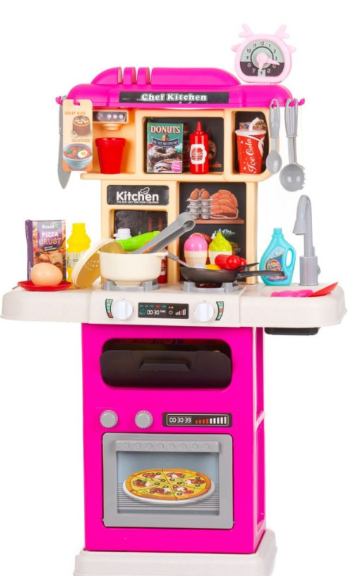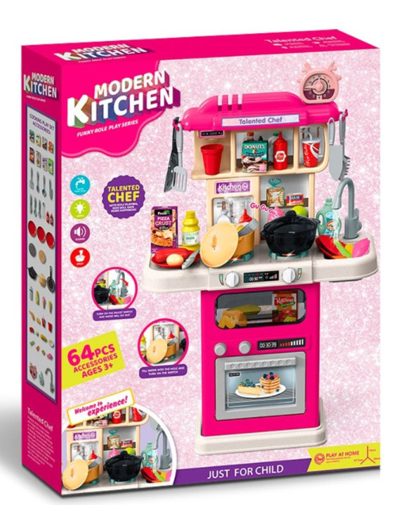 • Tartalmaz 64 különálló játékot és kiegészítőt - edényeket, csaptelepet, kiegészítő játék élelmiszereket és magát a konyhát.