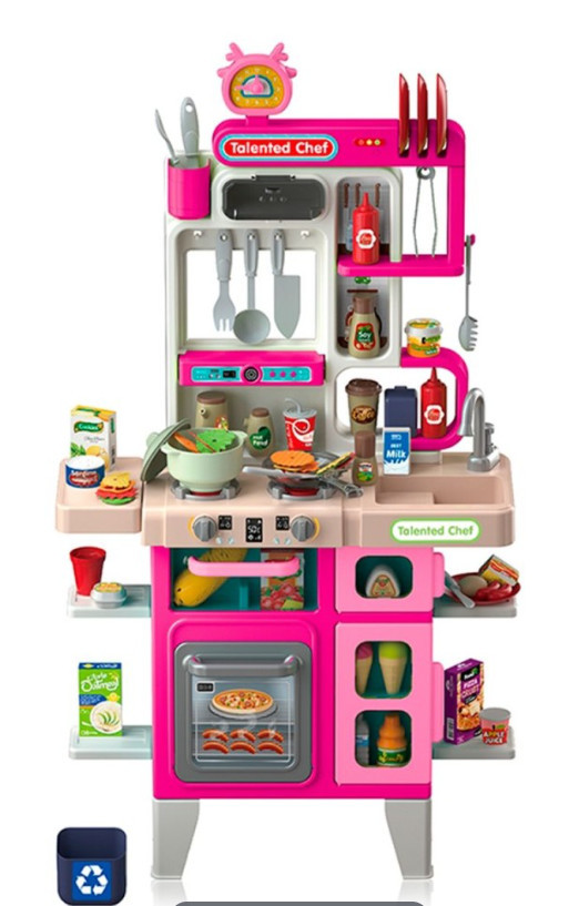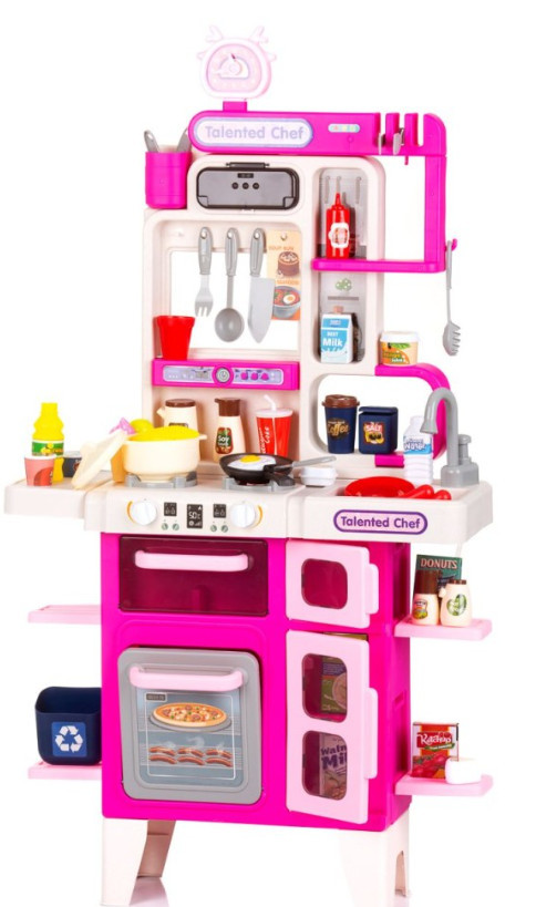 • Több különálló játékot és kiegészítőt - edényeket, csaptelepet, kiegészítő játék élelmiszereket és magát a konyhát.