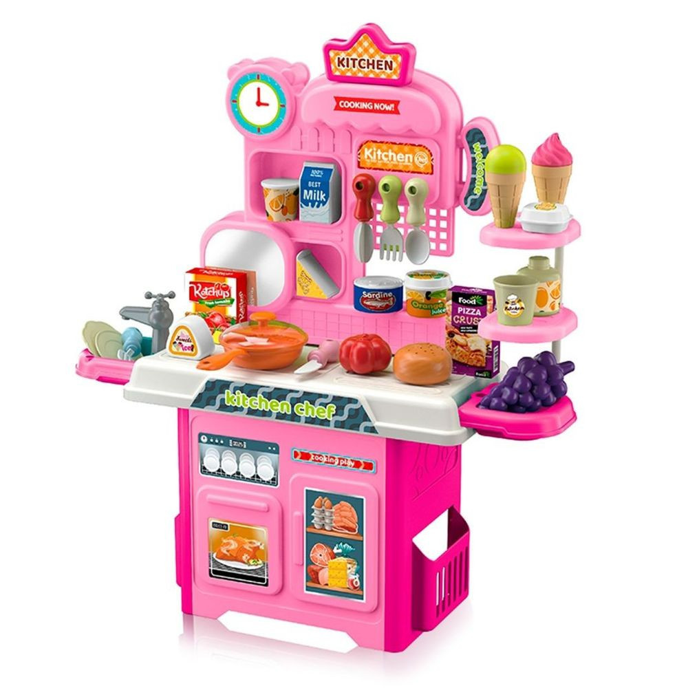 • Több különálló játékot és kiegészítőt is tartalmaz - edényeket, csaptelepet, kiegészítő játék élelmiszereket és magát a konyhát.