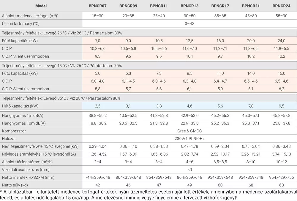 Műszaki adatok 26°C -os levegő, 26°C -os víz és 80% -os páratartalom esetén: