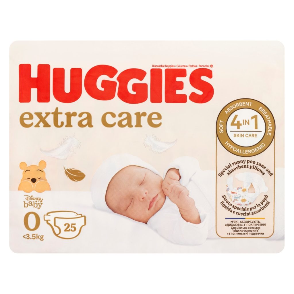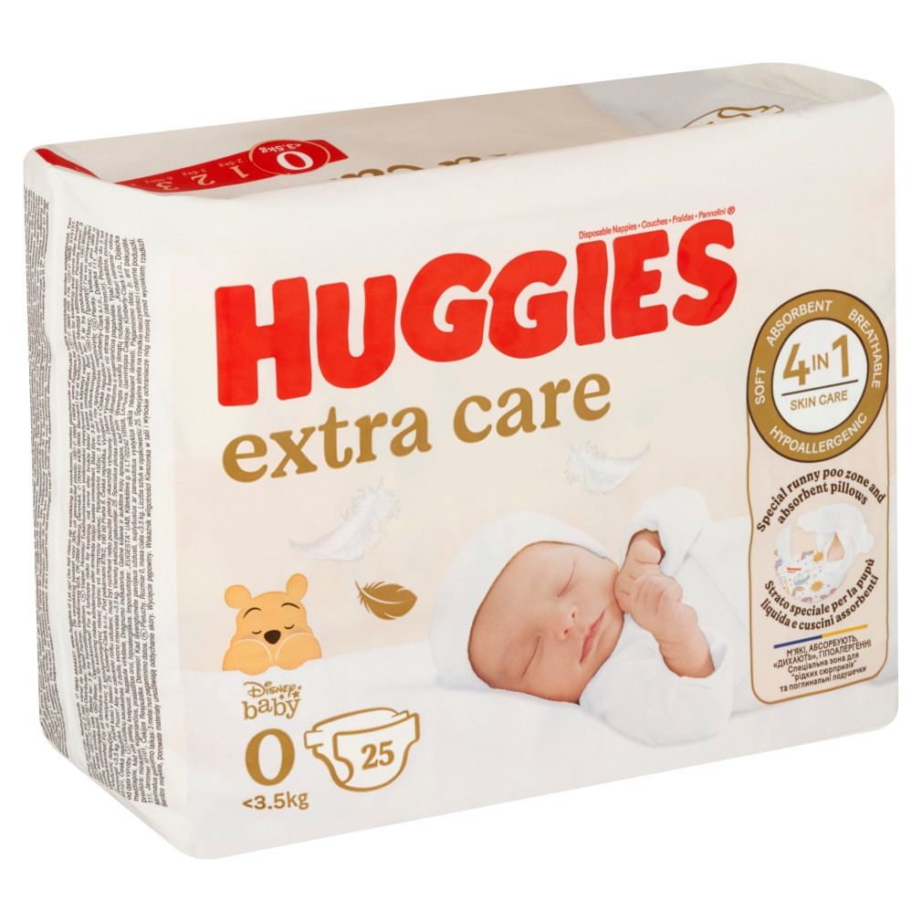 Huggies Extra Care pelenka, 0-4 kg, 25 db + ajándék Baba az autóban matrica leírása
