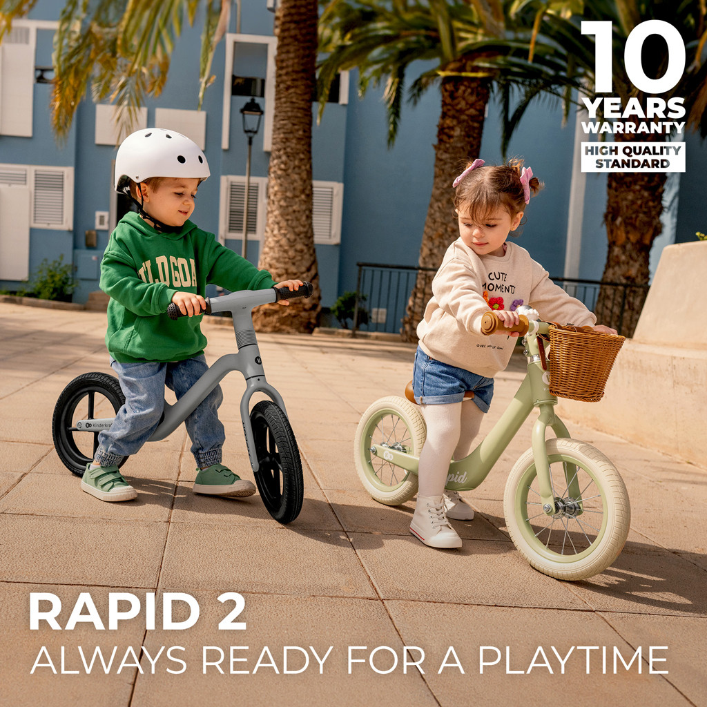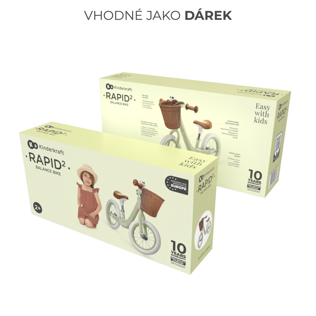 Fedezze fel a séták örömét retro designban! Ezt a kosaras biciklit a gyerekek és a szüleik is imádni fogják. A nagy felfújható kerekeknek köszönhetően ideális városi kirándulásokhoz és kalandokhoz az erdőben. A kerekek jól csillapítják az egyenetlen terepen való haladást.A kényelmes ülés széles magasságállítási tartományt tesz lehetővé, így a bicikli növekszik a gyermekével. A RAPID kerékpár kormányfordulat-korlátozóval is rendelkezik, amely megvédi a gyermeket a kontrollálatlan kanyarodástól a vezetés tanulása során. Az alacsonyra szerelt váz megkönnyíti a fel- és leszállást. A RAPID egyensúlyozó kerékpár, akárcsak minden más Kinderkraft egyensúlyozó kerékpár, elősegíti az egyensúly és a motoros képességek fejlődését, miközben szeretetet ébreszt gyermekében a szabadtéri tevékenységek iránt.Könnyű és erős A RAPID kerékpár nemcsak stílusos, hanem könnyű és erős is. Súlya alig 3,7 kg, és a magnéziumötvözetből készült váznak köszönhetően rendkívül ellenálló.Gumírozott markolatok A kormány gumírozott markolatokkal rendelkezik, amelyek ráadásul nem csúsznak meg. Ez megkönnyíti gyermekének a kerékpár irányítását bármilyen helyzetben, anélkül, hogy a kezei lecsúsznának a kormányról. Tartozék a gyönyörű kosár apróságoknak.Alacsonyra szerelt váz A RAPID kerékpár kisebb gyerekek számára is megfelelő. Az alacsonyra szerelt váz megkönnyíti a kisebb gyerekek fel- és leszállását.Állítható ülés Ebben a korban a gyerekek gyorsan nőnek – ezért a RAPID kerékpár állítható üléssel rendelkezik, amelyet könnyen beállíthat a gyermek magasságához. Az ülés 33,5–41,5 cm között állítható.Kormányfordulat-korlátozás A RAPID egyensúlyozó kerékpár kormányfordulat-korlátozó funkcióval van felszerelve. Ez csökkenti a hirtelen, kontrollálatlan kanyarodás kockázatát a vezetés tanulása során.Amortizált kerekek A RAPID kerékpár nagy felfújható kerekekkel rendelkezik csapágyakkal. Ezek jó rugózást biztosítanak mind a járdán, mind az egyenetlen erdei ösvényeken való haladáskor.Műszaki paraméterek:váz: magnéziumötvözetkerekek: gumiból, felfújhatókosár: műanyagMéretek:összeszerelt: 71 × 52,5 × 39,5 cmülés beállítása: 33,5–41,5 cmkerekek: 30 cmsúly: 3,7 kg