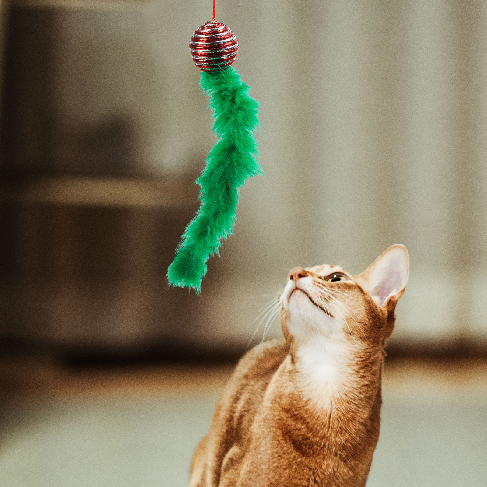 A karácsonyi lázból és dekorációból nem maradhatnak ki a házikedvencek sem. Ez a színes macskajáték, garantáltan cicája kedvence lesz, de az ünnepi eneteriőrbe is beleillik. A toll és a csillogó, mozgó dísz felkelti a cicák érdeklődését, a siker garantált.