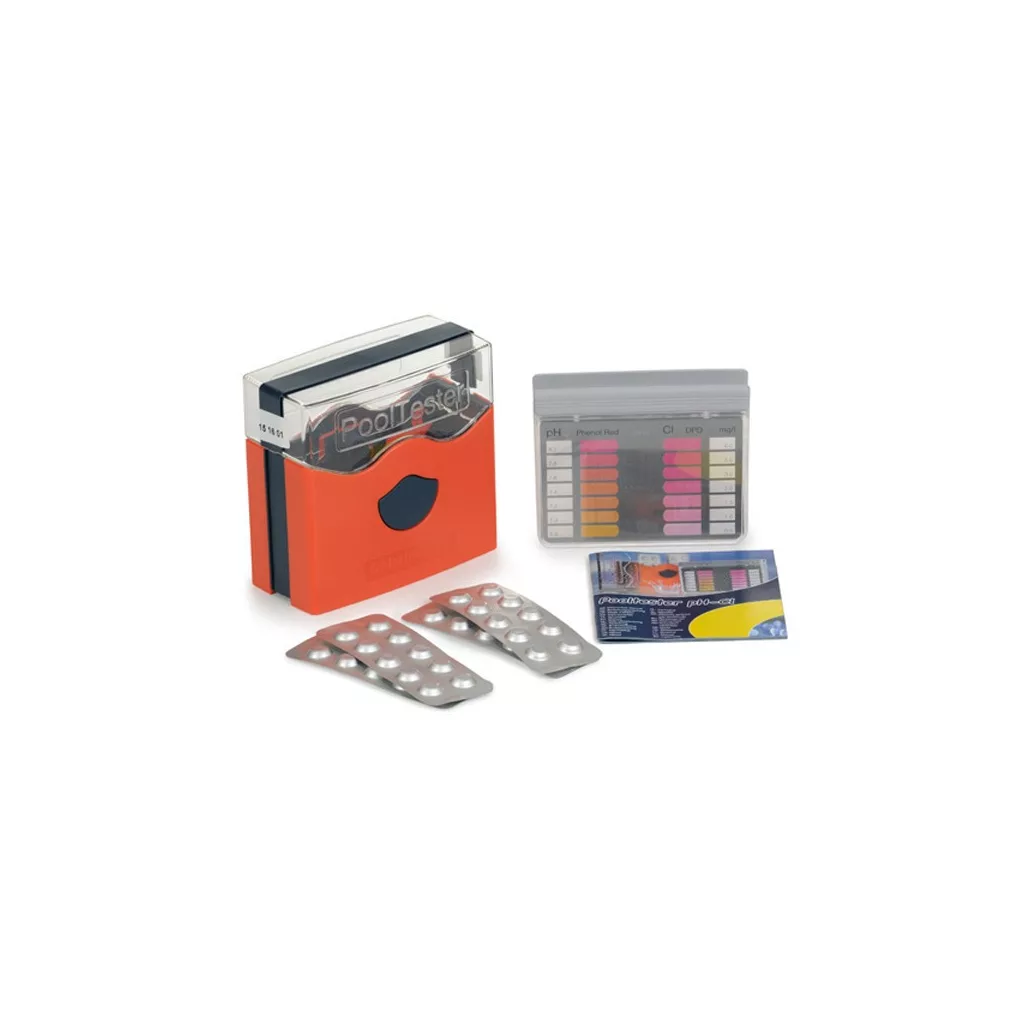 Vízminőség ellenőrző teszter a medencevíz klór tartalom és pH-érték méréshez. PHENOL RED és DPD-1 indikátor tablettát tartalmaz a medencevíz pH-értékének és klór tartalmának méréséhez. A tablettákat a mérőedény (teszter) megfelelő cellájába kell helyezni, miután a mérni kívánt vízzel a cellákat feltöltötte. A tabletták feloldódva a mérővíz színét megváltoztatják a pH-érték illetve a klór tartalom függvényében. A mérővíz színét a színskálával összehasonlítva megállapítható a víz pH-értéke és klór tartalma.