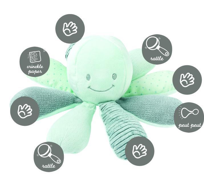 HU DescriptionEz a polip lesz a baba első igazi barátja, megnyugtatja, biztonságérzetet és kényelmet ad neki. A polip a születésétől kezdve megfelelő barátja a babának, és egész gyermekkorában hűséges társként és barátként kíséri őt. A polip puha és kellemes tapintású anyagból készült. - A polip csápjainak különböző funkciói vannak, amelyek segítik a baba motoros készségeinek fejlődését.- különböző textúrák és különböző hangok- mivel a csecsemőknek erősen fejlett a fogóreflexük, és hozzászoktak a köldökzsinór érintéséhez a pocakban, ezek a csápok elfoglalják a kis babakezeket és megnyugtatják őket.- a speciális anyag képes magába szívni az anya természetes illatát, így a baba biztonságban érzi magát.A polip tehát az első pillanatoktól kezdve elkíséri a babát, és igazi barátja lesz, aki megnyugtatja, biztonságérzetet és kényelmet nyújt nekiHadd adjunk néhány tippet, hogyan lehet a legjobban barátságot kötni a baba és a PIU PIU polip között:A babának meg kell szoknia, hogy egy játékhoz kötődik. Lehet, hogy ezt nem értjük, de el kell fogadnunk. Tartsa a polipot néhány éjszakán át maga mellett, hogy beszívja az Ön természetes illatát, ami megnyugtatja a babát. Javasoljuk, hogy vásároljon két polipot arra az esetre, ha elveszítené az egyiket. Ezzel elkerülheti a könnyező szemeket. Váltogassa a játékokat, hogy a baba ne érezzen különbséget, de mindig biztonságban érezze magát a pajtása mellett. - 30°C-on mosható- Anyag : 100% poliészterFigyelmeztetés: Mielott a játékot a gyermeknek adná, el kell távolítani a játék minden részérol a csomagolást és az összes muanyag rögzítoelemet. Olvassa el gyelmesen és orizze meg az információkat és az utasításokat.Szállító címe: Jollymex N.V., Lindestraat 18, 9240 Zele, Belgium (T +3252444515 / e-mail info@nattou.eu)
