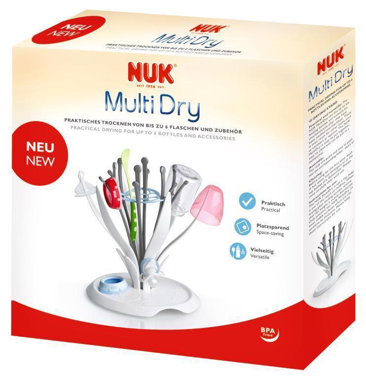 **Gyártó:** MAPA GmbH, Industriestraße 21 -25, 27404 Zeven, Németország. Spontexcz@newellco.com, info@nuk.cz, www.nuk.com. Tisztítás: Az első használat előtt mossa el forró vízben és mosogatószerben, vagy a mosogatógép felső rácsában. Mindig alaposan öblítse le minden használat után. Használati utasítás: A NUK Multi Dry nem játék, gyermekektől elzárva használható (apró alkatrészeket tartalmaz). Üveg cumisüveg szárításakor ügyeljen arra, hogy a súly egyenletesen oszlik el. Csak stabil, nedvességálló felületre helyezze.