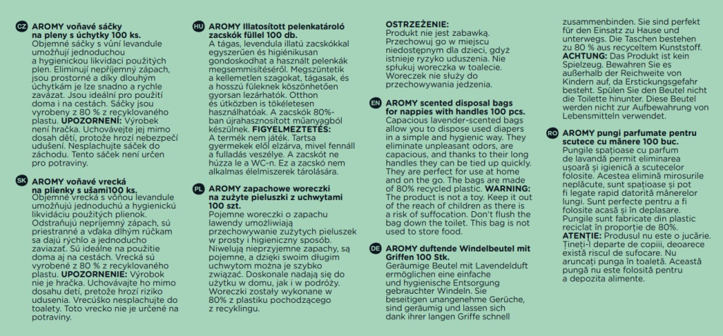 HU DescriptionAz AROMY illatosított zacskók a használt pelenkák tárolására nélkülözhetetlen segítői a baba mindennapi ellátásának! A finom levendula illatú, tágas zacskók megkönnyítik a tisztaság és a frissesség megőrzését.A levendula a kellemetlen szagok megszüntetésének titkos eszköze! Az AROMY zacskók nemcsak a nemkívánatos szagok ellen védenek, hanem gyengéden nyugtató illatot is terjesztenek a levegőben. Ráadásul a zacskó lila színe elrejti a tartalmát.A zacskókat a mindennapi kényelmet szem előtt tartva tervezték. Méretük lehetővé teszi, hogy több pelenka is elférjen bennük, a hosszú füleknek köszönhetően pedig a zacskó gyorsan és higiénikusan beköthető.A praktikus zacskók más helyzetekben is hasznosak lehetnek - hosszú autóút során kis szemeteszsákként használhatja őket, vagy elrejtheti bennük a nedves ruhadarabokat vagy a használt zsebkendőket.Az AROMY zacskók gyártásához használt anyagok mintegy 80%-a újrahasznosított. Az AROMY zacskók választásával nemcsak a higiéniáról és a kényelemről gondoskodik, hanem a környezetvédelmet is támogatja.Az AROMY nem csak egy pelenkatároló zacskó, hanem egy olyan eszköz, amely megkönnyíti az életét a baba gondozása során. A zacskók ideálisak otthon és útközben is. Adja meg magának és babájának a megérdemelt kényelmet és frissességet! Technikai adatok: - tágas zacskók, hosszú, megkötős fülekkel - strapabíró, nem szakad - levendula illattal a kellemetlen szagok semlegesítése érdekében - a lila szín elrejti a tartalmat - mennyiség: 100 zacskó csomagonként- zacskó térfogata 4 - 4,5 l- méret 18 x 38 cm- vastagság: 12 μMagyarországi képviselő: ags92 Kft., HU-9028 Győr, Szent Imre út 61/A⁠info@petiteetmars.com ⁠