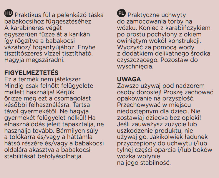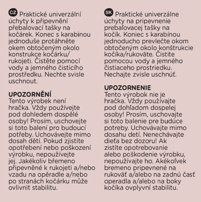 Praktikus fül a pelenkázó táska babakocsihoz való rögzítéséhezA karabíneres végét egyszerűen fűzze át a karikán, így rögzítve a babakocsi vázához/ fogantyújához.-egyszerű rögzítés karabíner segítségével-univerzális bármilyen típusú babakocsihoz-csúszásmentes felület2 db egy csomagbanMagyarországi képviselő: ags92 Kft., HU-9028 Győr, Szent Imre út 61/A⁠info@petiteetmars.com ⁠