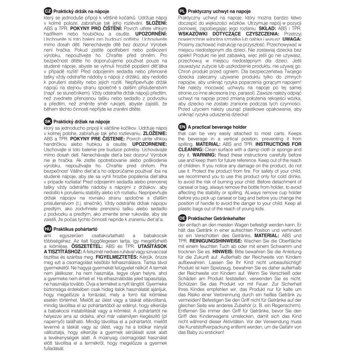 HU DescriptionPraktikus pohártartó, ami egyszerűen csatlakoztatható a babakocsik többségére. A lágy műanyag fékek a tartó belsejében biztosítják a különböző típusú palackok és csészék tapadását. Biztonságosan mosható. Az italt függőlegesen tartja, így megelőzhető a kiömlése. A pohár könnyen lecsatolható az alapról abban az esetben, ha nem használja.Magyarországi képviselő: ags92 Kft., HU-9028 Győr, Szent Imre út 61/A⁠info@petiteetmars.com ⁠