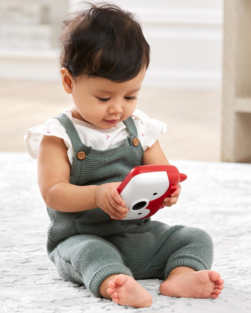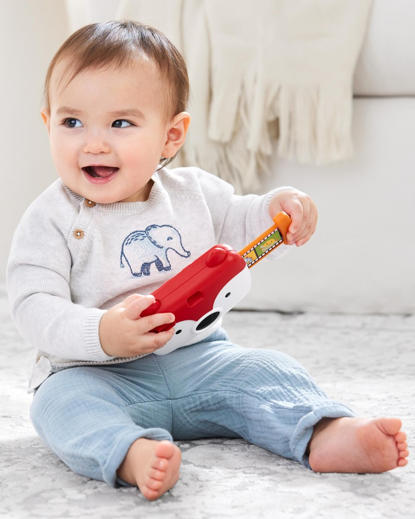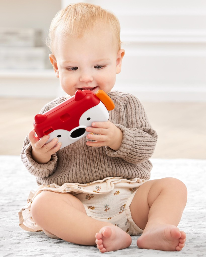Egy, kettő, három… mondjátok „sajt!” A barátságos róka fényképezőgépünkszórakoztató „filmmel”, valósághű zárhangokkal, villanófényekkel, gyermektükörrel és más csodálatos funkciókkal van felszerelve, amelyeket a kisfotósok imádni fognak! Csak meg kell nyomni a róka fülét, hogy elkezdődjöna fényképezés!Jellemzők:4 szórakoztató hang: zárhang, bumm!, kacagás és duda.Valósághű villogó fény.Nyomja meg a fület a hangokért és fényekért.Gyermek tükör, amely elősegíti az önismeretet.Kihúzható „film” a Skip Hop jellegzetes mintájával.Nézőlyuk.Könnyen fogható kis kezekben.Életkor 6h+.Összhangban a Skip Hop Explore & More™ kollekcióvalMéretek (cm): 14 H x 4 Sz x 9,40 MKarbantartás: Törölje le enyhén nedves ruhával; tárolás előtthagyja megszáradni a levegőn. Ne merítse vízbe. A termék élettartamánakmeghosszabbítása érdekében távolítsa el az elemeket, amikor a játékottárolja.