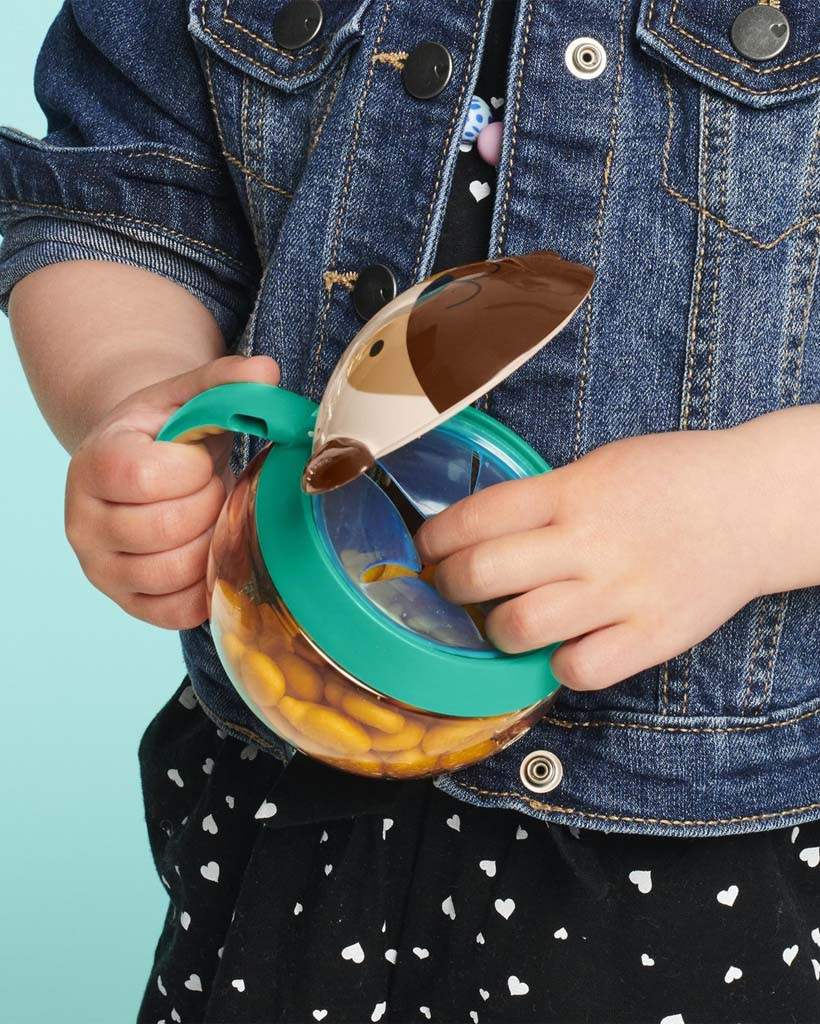 Okos ötlet utazáshoz. A pohárka fedelét kinyitás után tartja, a tartalom kiszóródását rugalmas lamellák védik, amelyek beengedik a gyermek kezét, de nem engedik ki az uzsonnát. A pohárka átlátszó, hogy időben újratölthető legyen. Az oldalán praktikus fül található gyermek méretben, amellyel a pohárka akár egy babakocsira vagy táskára is rögzíthető. 0 % BPA, 0 % PVC, ftalátmentes. Tartalom: 222 ml. Átmérő: 10 cmA termék méretei: 12 cm x 9,4 cm x 8,8 cm