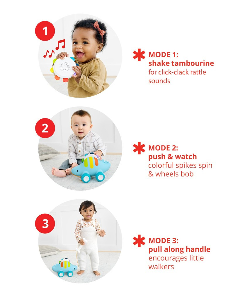 A mi aranyos, remegő stegosaurusunk három játékmódjának köszönhetően – tamburin, tolható játék és húzható játék – együtt nő a gyermekkel, az ülő helyzettől egészen a járásig. A levehető tamburin könnyen remeg a kis kezekben. Vagy helyezze a tamburint a dinoszaurusz hátára, nyomja meg, és figyelje, ahogy a tüskék forognak, miközben a kerekek fel-le mozognak. A csatlakoztatott „csont” fogantyú mód arra ösztönzi a kis járókat, hogy vigyék magukkal szórakoztató dino barátjukat sétára.Jellemzők:3 játékmód: tamburin, tolható játék, húzható játéklevehető tamburin, amely kattogó hangokat ad kinyomja meg vagy húzza meg, hogy a színes tüskék forogjanak és a kerekek forogjanaktámogatja a motorikus készségeket és a szem-kéz koordinációtsegít megtanulni az ok-okozati összefüggéseketalul rögzíthető csont fogantyú12 hónapos kortólösszehangolható a Skip Hop Explore & More kollekcióvalMéretek (H x Sz x M): 24,38 × 13,20 × 16,76 cmÁpolás: Tisztítsa nedves szivaccsal vagy ruhával; levegőn szárítsa.