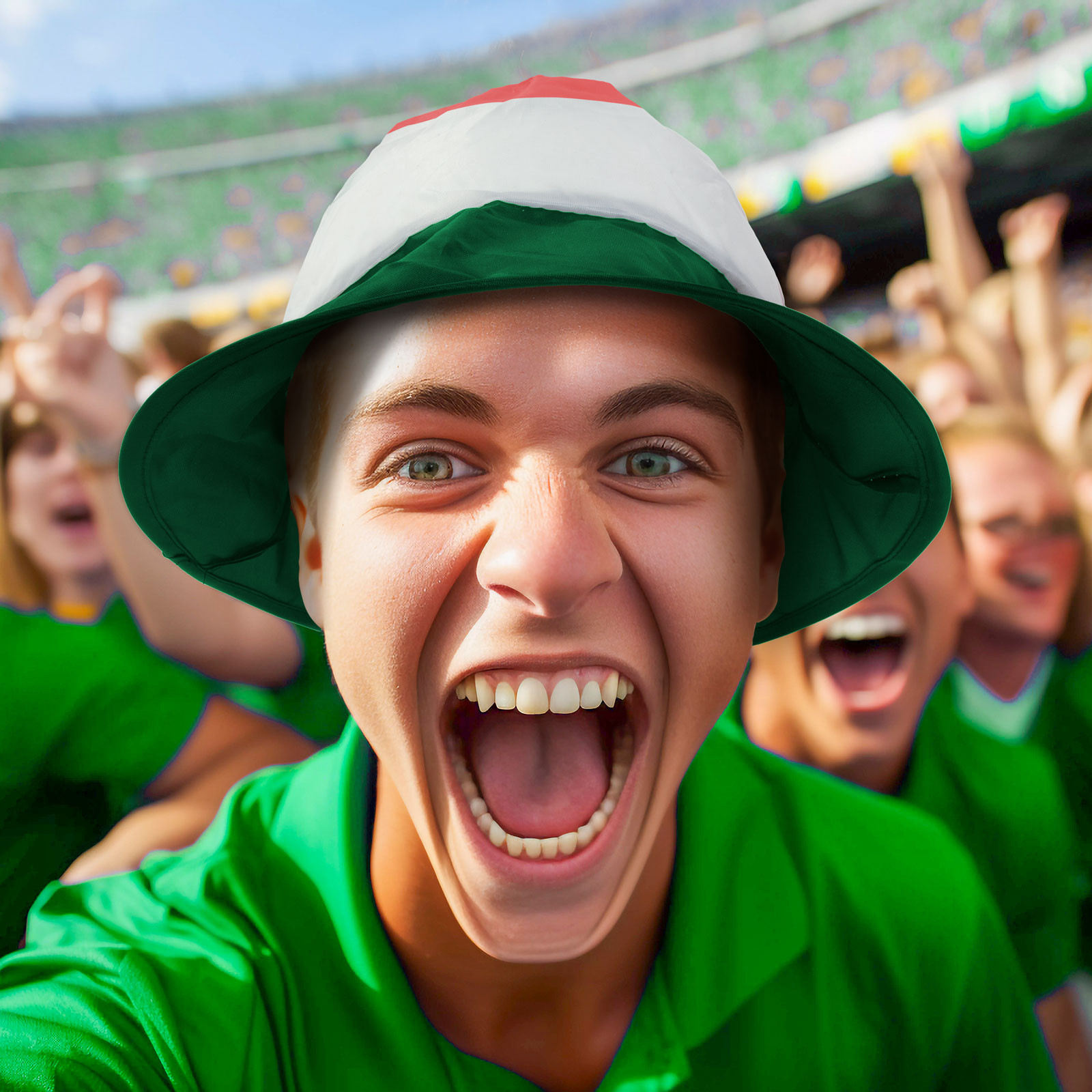 Ünnepeljen magyar sporteseményeket, szurkolói kalapban, dudával, zászlóval.