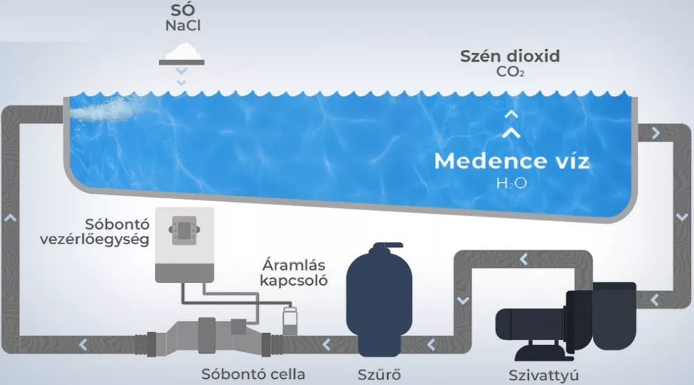 A szükséges koncentráció: 4 kg/m3, azaz pl. egy 100m3-es medencébe 400kg sót kell szórnunk a medence feltöltésekor. A sóból a fertőtlenítő készülékben, elektrokémiai reakció (elektrolízis) révén klórgáz képződik, a klórgáz és víz reakciójából pedig hipoklórossav (HClO), a tulajdonképpeni szabad aktív klór jön létre, ugyanaz a vegyület, amely a hagyományos klórtabletták, klórgáz, klórdioxid, vagy hipó alkalmazásakor.