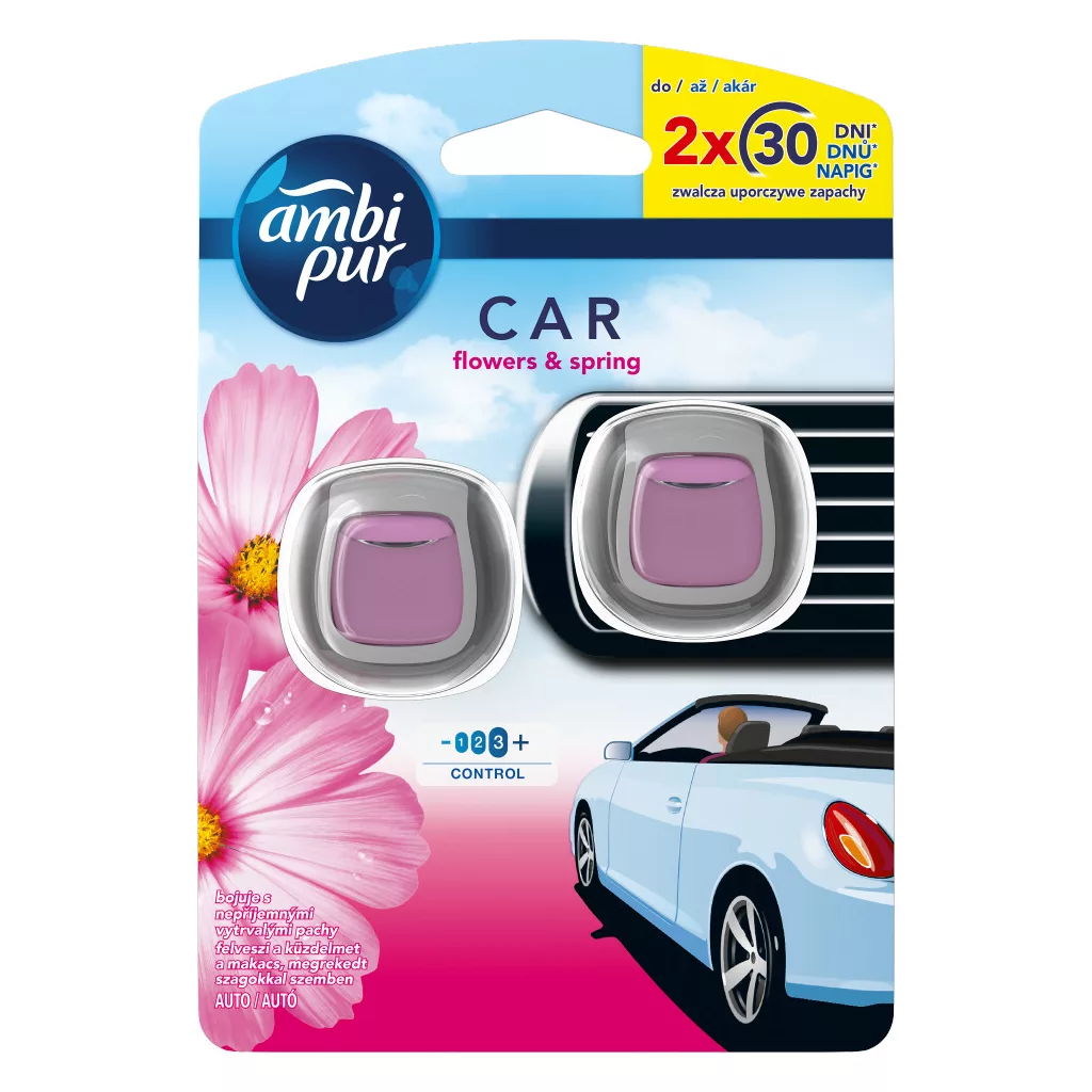 Az Odourclear technológiával készült Ambi Pur megszünteti az autóban rekedt kellemetlen szagokat, és friss illatot hagy maga után akár 30 napon át. A Flowers & Spring üde, frissítő aromát csempész az otthonába, amely az első tavaszi napsugarak és a rügyező virágok illatát idézi. A legtöbb autóillatosítóval szemben – melyek többnyire csupán elfedik a szagokat – az Ambi Pur ténylegesen megszünteti azokat, és kellemesen friss illatot hagy maga után a gépjármű utasterében. Ez az apró és diszkrét, a gépjármű szellőzőrácsára könnyen felcsíptethető eszköz a különleges Odourclear technológiának köszönhetően még a legmakacsabb szagokat is megszünteti (amit például az ételek, háziállatok, dohányfüst vagy hulladékok okoznak), és felfrissíti az utastér levegőjét. Az illat intenzitása az eszköz oldalán található szabályozó segítségével állítható. Az Ambi Pur autóillatosító könnyen használható, működése nem igényel elemet vagy áramot. Akár 30 napon át tart, így Ön és utasai kellemes illatnak örvendhetnek. Próbálja ki az Odourclear technológiával ellátott Ambi Pur termékek széles választékát, többek között az Ambi Pur szövetfrissítőt, amely az autó kárpitjából távolítja el a szagokat. Otthonában pedig használja az Ambi Pur aeroszolos légfrissítőt, illetve a Small Spaces illatosítót. Próbálja ki a 3Volution elektromos illatpárologtató készülékeket is, amelyek akár 90 napon át szüntetik meg a szagokat.
