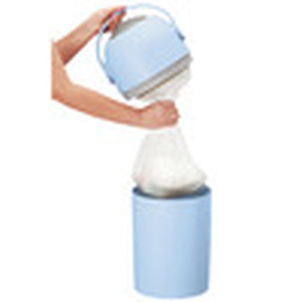 Ha megtelt a tároló, le kell venni a fedelet a nagy kék gomb megnyomása után, kivenni a teli zsákot és kidobni a szemeteskukába. Könnyen tisztítható.