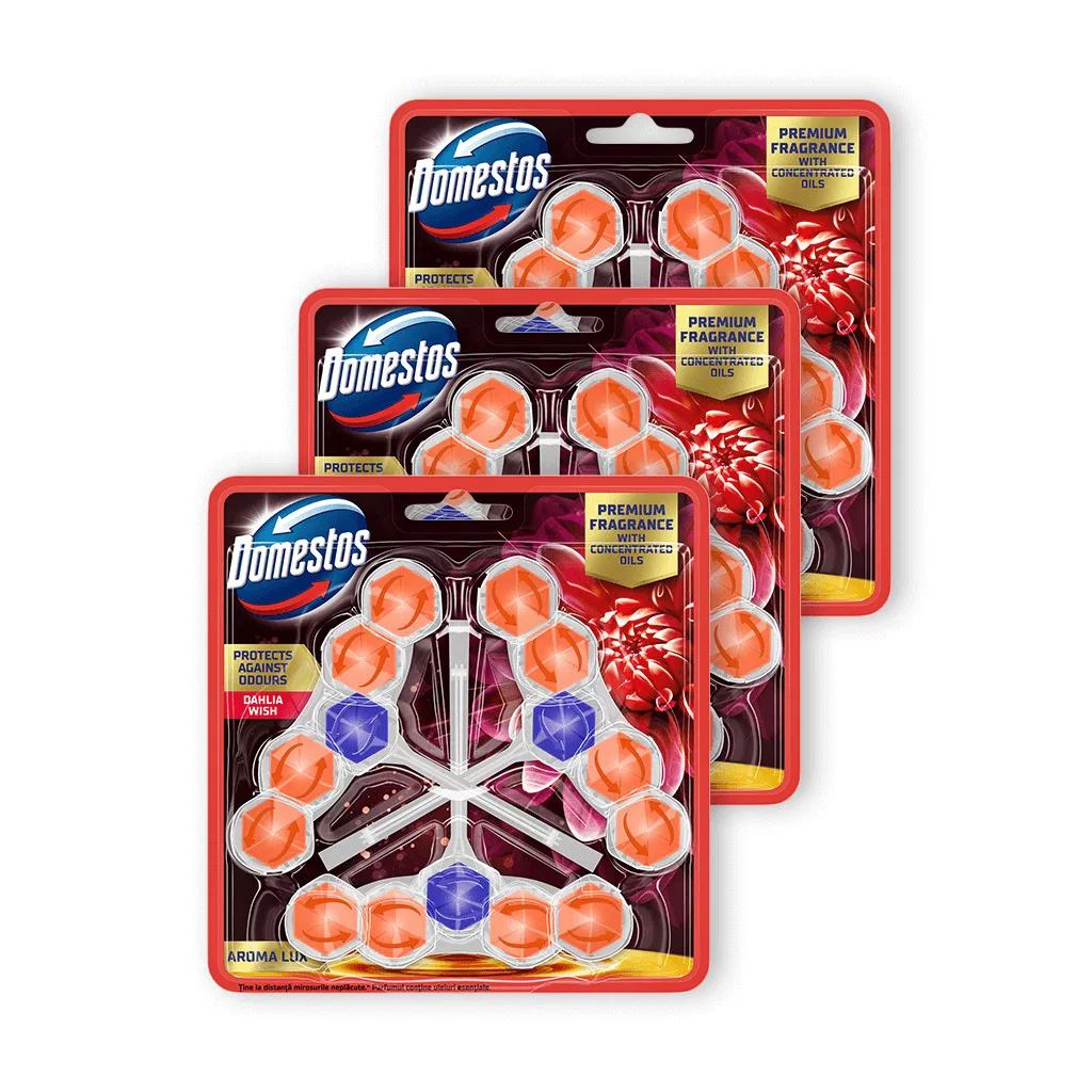 Domestos Aroma Lux WC frissítő blokk, Dahlia Wish, koncentrált illóolajokkal (3x3x50 g) leírása