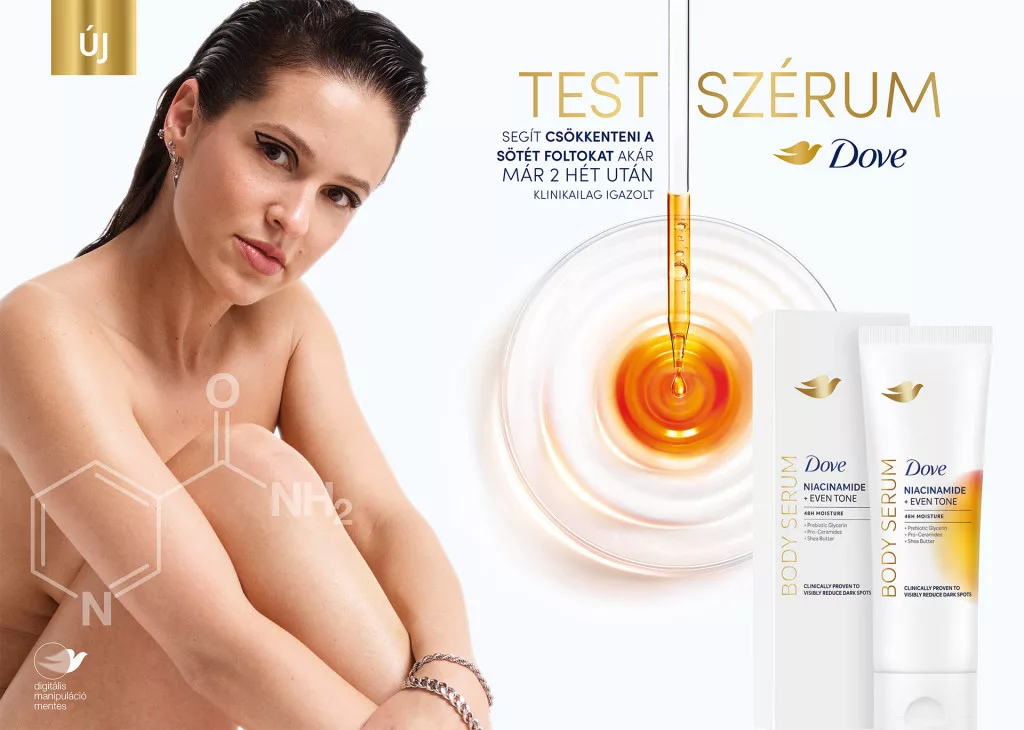 A DOVE TESTSZÉRUMOK ÚJ DIMENZIÓT NYITNAK A BŐRÁPOLÁSBAN: látható eredményeket nyújtanak a bőrkárosodás jelei ellen, hidratálással, koncentrált hatóanyagokkal és luxusérzetű, bársonyos textúrával – miközben könnyed, gyorsan felszívódó formulájukkal felülírják a hagyományos testápolókkal kapcsolatos negatív élményeket. Klinikailag igazoltan láthatóan csökkenti a pigmentfoltokat már két hét alatt.
