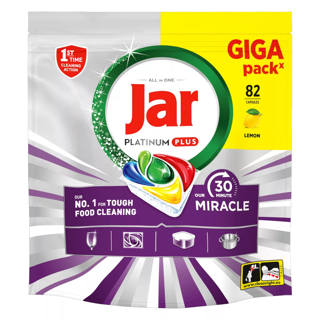 ALL IN ONE VARÁZSLAT A RAGYOGÓ EDÉNYEKÉRT, KÖNNYEDÉN. Jar Our 30 Minute Miracle Platinum Plus – az 1. számú megoldásunk a makacs ételmaradványokkal szemben. Ezek az all in one mosogatókapszulák makulátlan végeredményt nyújtanak még a legrövidebb programok esetén is, kellemes citromillatot hagyva maguk után. Az intenzív hatású, ötrekeszes kapszula ragyogóan tiszta és csillogó edényeket hagy maga után, gyors száradást eredményez, a zsíros szűrőt is tisztítja, valamint megfakulás elleni technológiával rendelkezik. A Jar Original All-in-One termékhez képest 3x több zsíroldó összetevővel mindössze 30 perc alatt eltávolítja a legmakacsabb ételmaradványokat is. A Jar már az 1. alkalommal hatékonyan tisztít hosszú és rövid programokon egyaránt, így sem elő-, sem újramosogatásra nincs szükség. Éppoly hatékony, mint a Jar folyékony mosogatószer, csak egy kényelmes mosogatókapszula formájában. A Jar mosogatókapszulával nincs szükség külön vízlágyító sóra vagy öblítőszerre. Mivel gyorsan és makulátlanul tisztít, ezért tökéletes megoldás a gyakran mosogató háztartások számára, az éjszakai áztatás hatékonyságával. Tapasztalja meg a Miracle erejét és élvezze a ragyogó végeredményt a Jar 5 rekeszes tisztítóerejének köszönhetően.