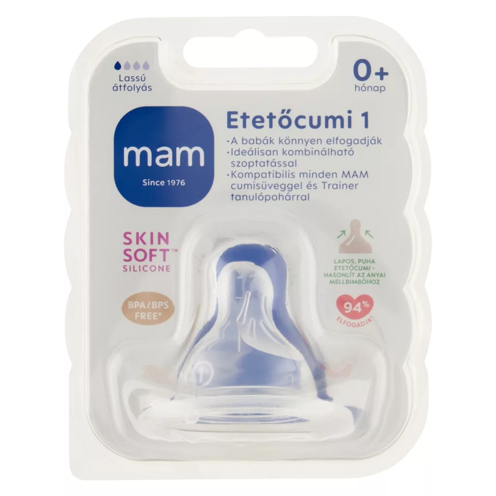 A MAM 0+ hónapos etetőcumi újszülöttek számára készült, lassú folyású kialakításával ideális az első etetésekhez és az anyatejhez is. A SkinSoft™ szilikon felület természetes érzetének köszönhetően megkönnyíti az elfogadást a babák számára.