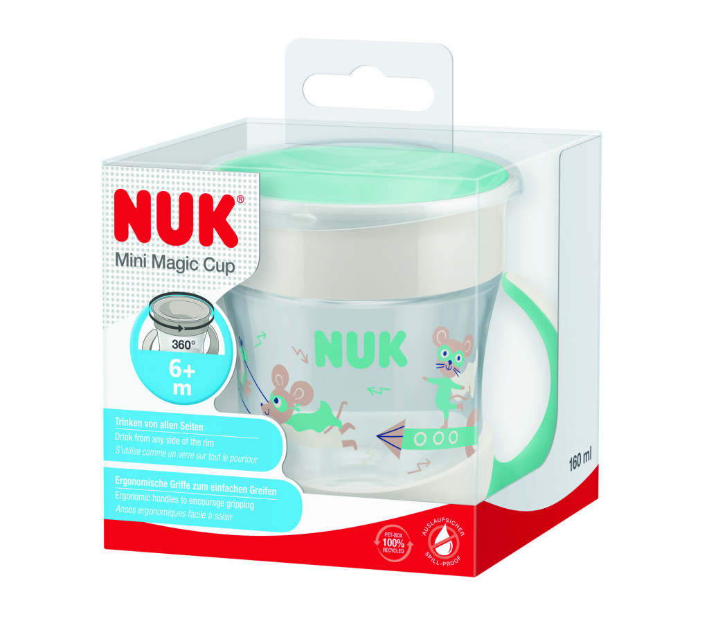 A NUK Mini Magic Cup Night  160ml űrtartalmú, egyedi, 360° os ivókarimával, tömítő szilikon koronggal, 6 hónapos kortól. Mint minden NUK pohár, a NUK Mini Magic Cup Night is szivárgásmentes. Az ergonomikus fogantyúknak köszönhetően még a kis ujjak és kezek is könnyedén megfoghatják.