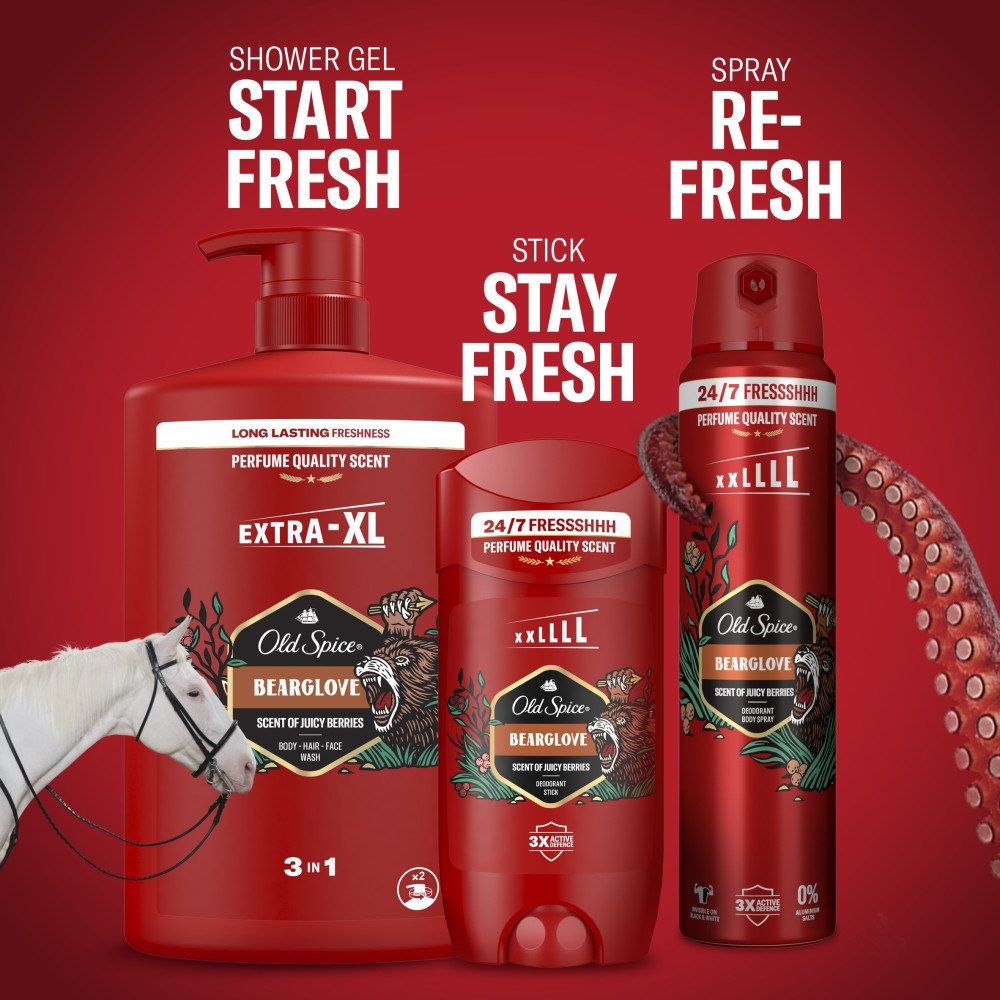 • PRÓBÁLD KI AZ OLD SPICE BEARGLOVE PARFÜMMINŐSÉGŰ ILLATÁT: A lédús bogyós gyümölcsök, a pikáns citrus és a zsenge alma illata némi fűszeres jeggyel párosulva a legádázabb ragadozóvá tesz a vadonban.