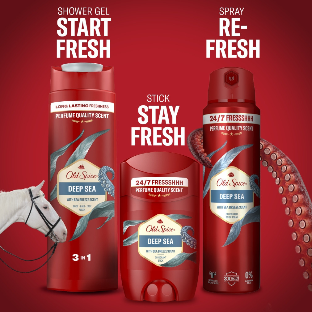 • Próbáld ki az Old Spice Deep Sea parfümminőségű illatát: A tengeri szellőt, a pompás virágokat és a lédús citrust idéző friss illat egy igazi víz alatti Paradicsomba visz.
