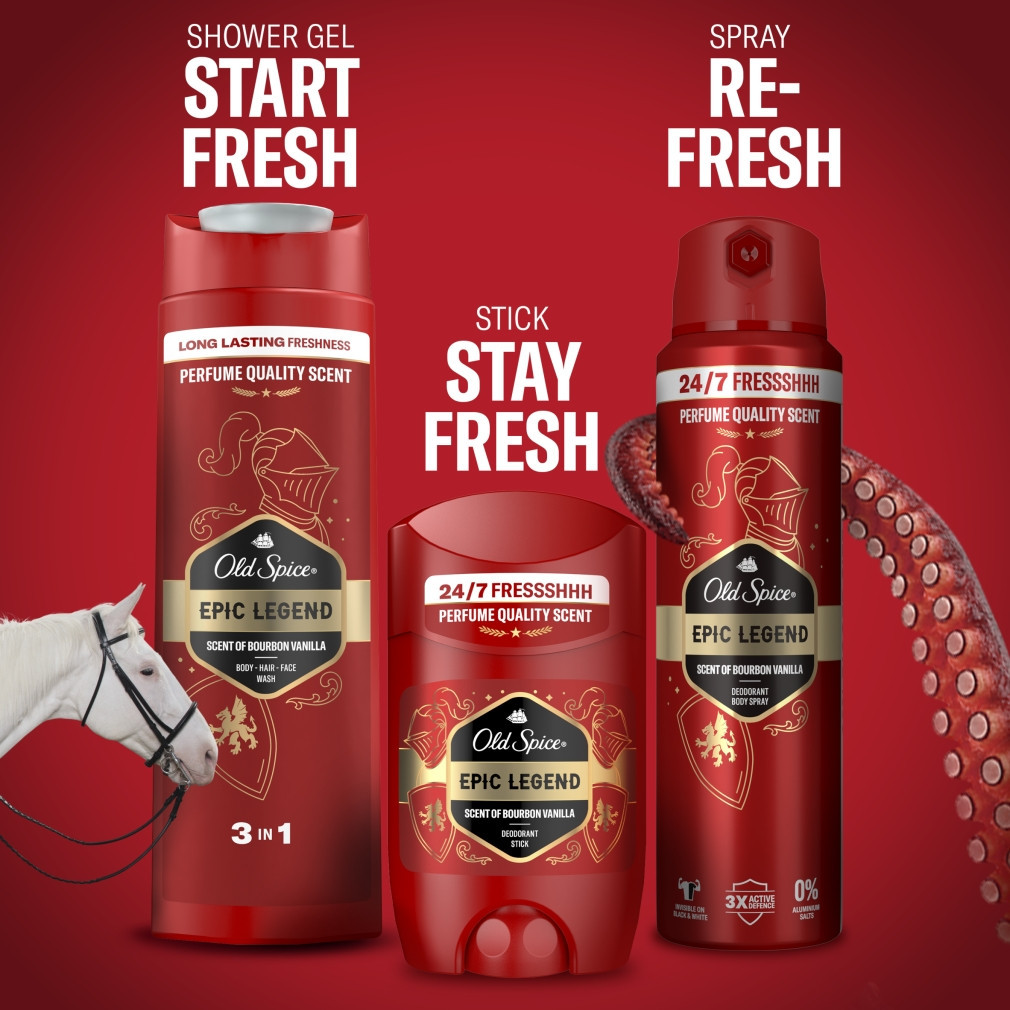 Élvezd az Old Spice Epic Legend deo spray megállíthatatlan frissességet* és magabiztosságot sugárzó illatát. A gondtalan frissesség ezen fokán végre fontosabb feladatokra is koncentrálhatsz: például menő szerződéseket köthetsz, vagy beszélni taníthatod a halakat. Engedd szabadjára a 3x-os aktív védelmet: Tartós illat, védelem a szagok ellen, szagmegszüntetés így éjjel-nappal legendásan illatozhatsz* A bourbon vanília, a cseresznyés dohány, a füstölt tölgyfa és a meleg ámbra illata a frissesség legendás lovagjává avat Ja, és azt említettük már, hogy 0% alumíniumsót tartalmaz, és úgy nyújt védelmet, hogy a fekete vagy fehér ruhákon sem hagy nyomot? Mert pontosan ezt teszi. *Mindennapos használat esetén.