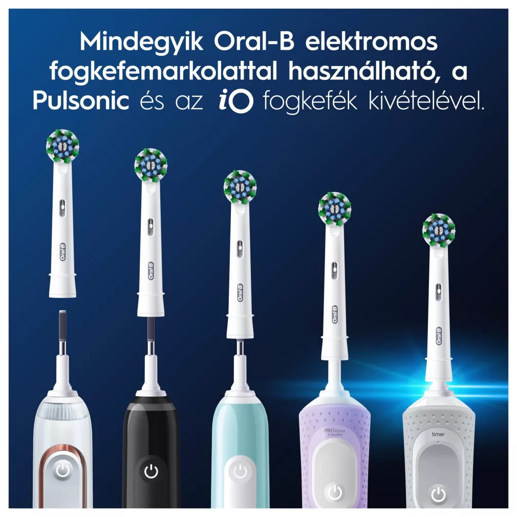 Az Oral-B Pro Cross Action fogkefe fejének több mint 2200, tökéletes dőlésszögben kialakított sörtéje akár 100%-kal több bakteriális lepedéket távolít el – a tisztább fogak és az egészségesebb fogíny érdekében –, mint az Oral-B manuális fogkefék. Az eredeti Oral-B fogkefefejek az új, X alakú sörteszálakkal olyan helyeket is sikeresen megtisztítanak, amelyeket a kerek sörték nem érnek el. A fogkefefej használtság jelzője a 100%-os tisztítási hatékonyság érdekében a sörték színét zöldről sárgára változtatja, ezzel jelezve, hogy elérkezett a csere ideje. Garantáltan minden Oral-B tölthető elektromos fogkefével használható, a Pulsonic és iO fogkefék kivételével.