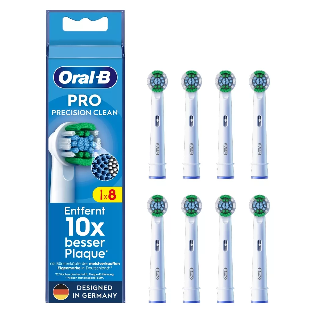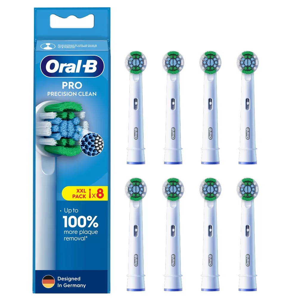 Az Oral-B Pro Precision Clean fogkefefej sörtéi az Oral-B manuális fogkefékhez képest sokkal alaposabban, fogról fogra haladva távolítják el a lepedéket. Az eredeti Oral-B fogkefefejek az új, X alakú sörteszálakkal olyan helyeket is sikeresen megtisztítanak, amelyeket a kerek sörték nem érnek el. A fogkefefej használtság jelzője a 100%-os tisztítási hatékonyság érdekében a sörték színét zöldről sárgára változtatja, ezzel jelezve, hogy elérkezett a csere ideje. Garantáltan minden Oral-B tölthető elektromos fogkefével használható, a Pulsonic és iO fogkefék kivételével.