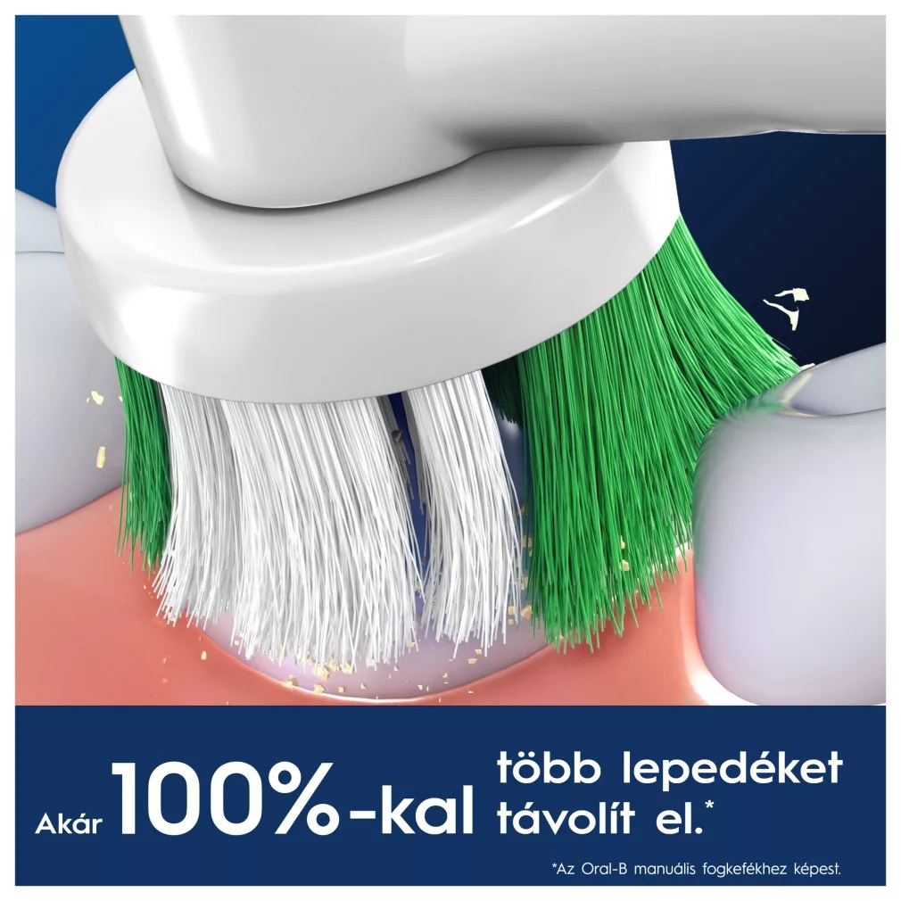 • Az Oral-B manuális fogkefékhez képest akár 100%-kal több bakteriális lepedék eltávolítására képes a tisztább fogak és az egészségesebb fogíny érdekében.