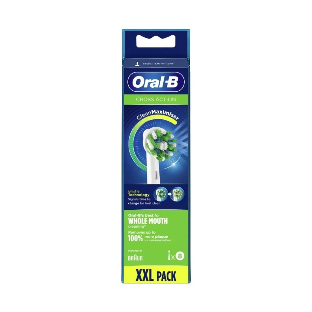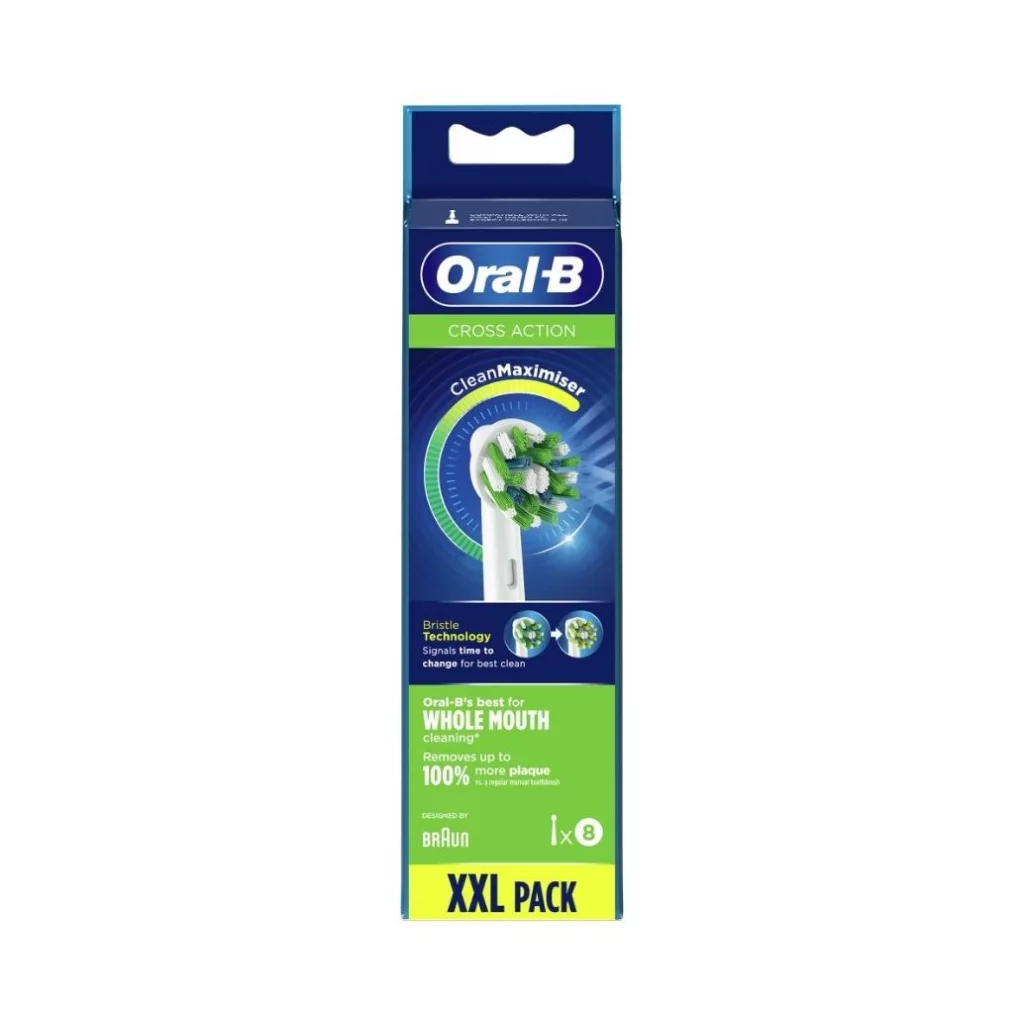 Az Oral-B elektromos fogkefékhez készült prémium minőségű CrossAction pótfej tökéletes, 16 fokos dőlésszögben kialakított sörtéi akár 100%-kal több lepedéket távolítanak el, mint az Oral-B manuális fogkefék. A továbbfejlesztett Oral-B CrossAction fogkefefej CleanMaximiser technológiával rendelkezik, amely a zöld sörtéket sárgává változtatja, az optimális teljesítmény biztosítása, és a kiváló tisztítás érdekében.