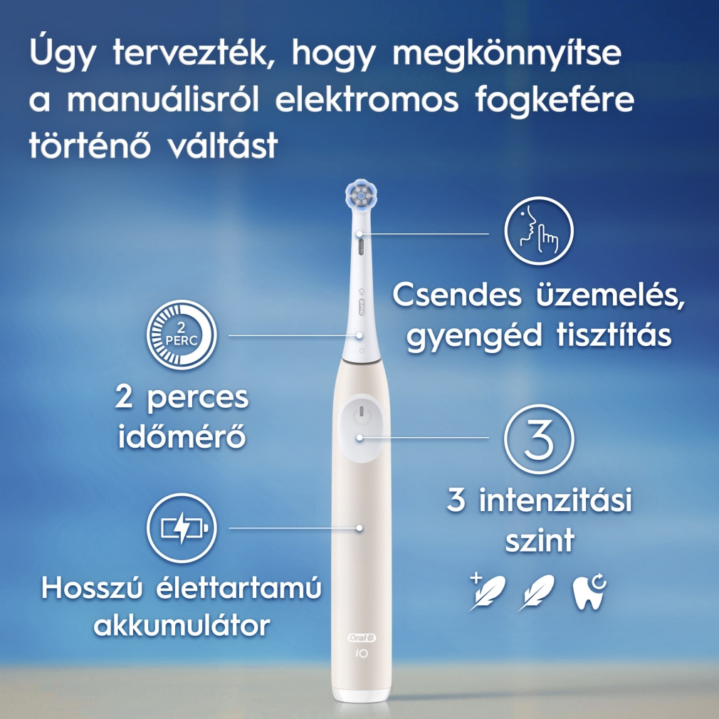 Az iO 2 elektromos fogkefe a gyengéd mikrovibrációkat és a fogászati eszközök ihlette, különleges, kerek fogkefefejet egyesíti a professzionális tisztítás élményéért. A legjobb eredmény érdekében 3 havonta cserélje le az Oral-B iO fogkefefejet.