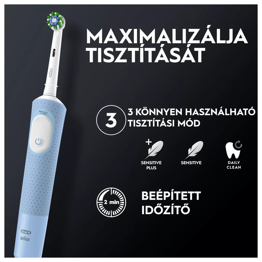 Az Oral-B Vitality Pro tölthető elektromos fogkefe klinikailag igazoltan hatékonyabban tisztít, mint az általános manuális fogkefék. A fogkefe háromféle fogmosási üzemmóddal rendelkezik: mindennapos, érzékeny, illetve érzékeny „plusz” fogmosási üzemmód a hihetetlenül gyengéd fogmosási élményért. A markolatba épített időmérő segít a fogorvosok által javasolt 2 perces fogmosási idő betartásában. Mindezt az Oral-B, a fogorvosok által világszerte használt fogkefemárka kínálja Önnek.