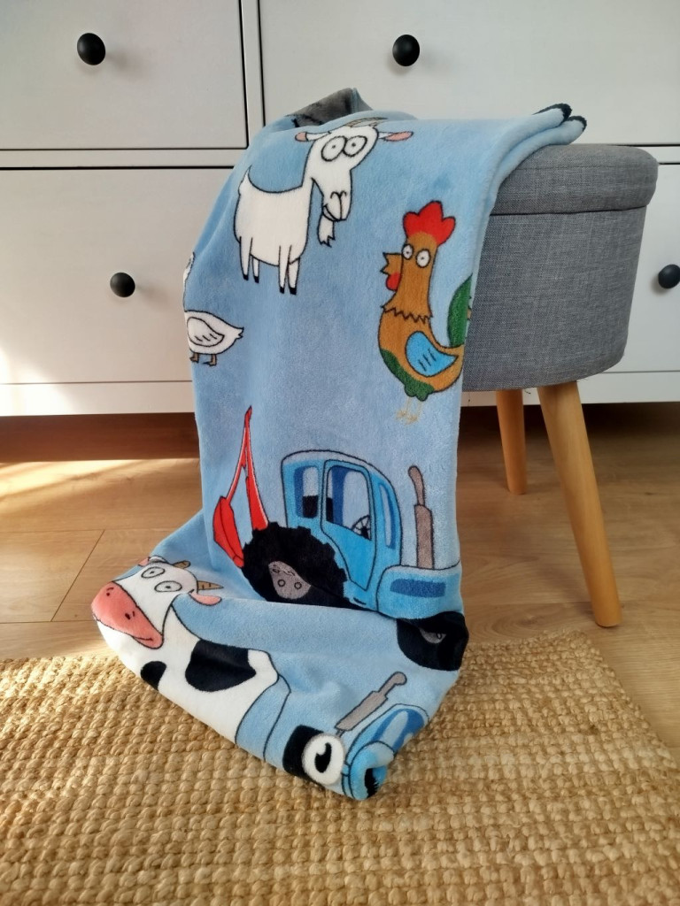 Pihe Puha babatakaró plüss anyagból - tehén + traktor minta (75x120 cm)