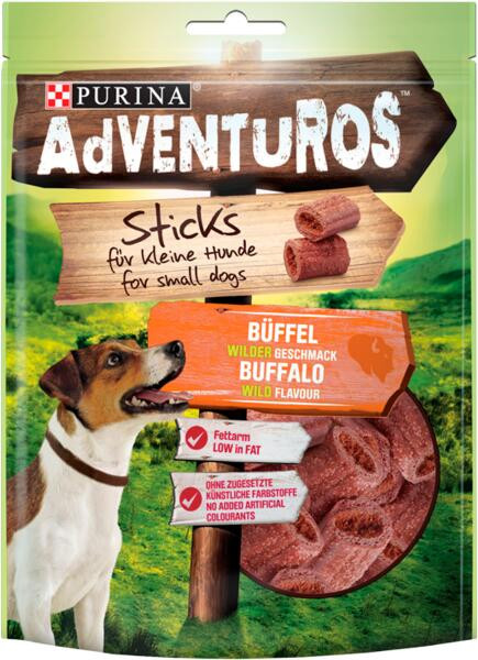 Vélemények Purina Adventuros Sticks jutalomfalat kistestű kutyáknak bölény, vad ízű (90 g)