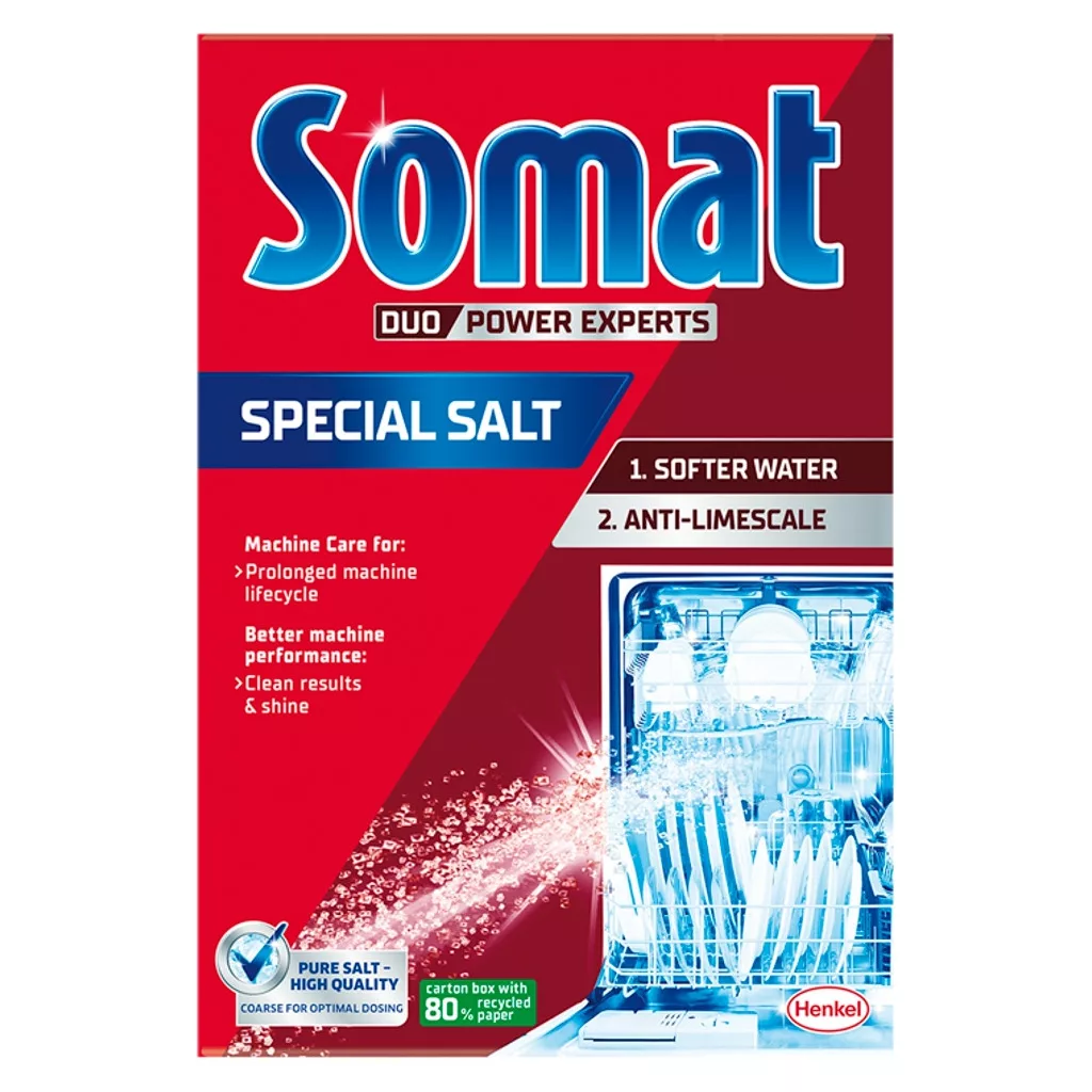Somat vízlágyító só vízkőlerakódás-gátló hatással, hosszabb élettartamot biztosít mosogatógépének és fontos részeinek, mint például a csöveknek vagy a fúvókának. Javítja a mosogatógép teljesítményét és véd a vízfoltok ellen is.