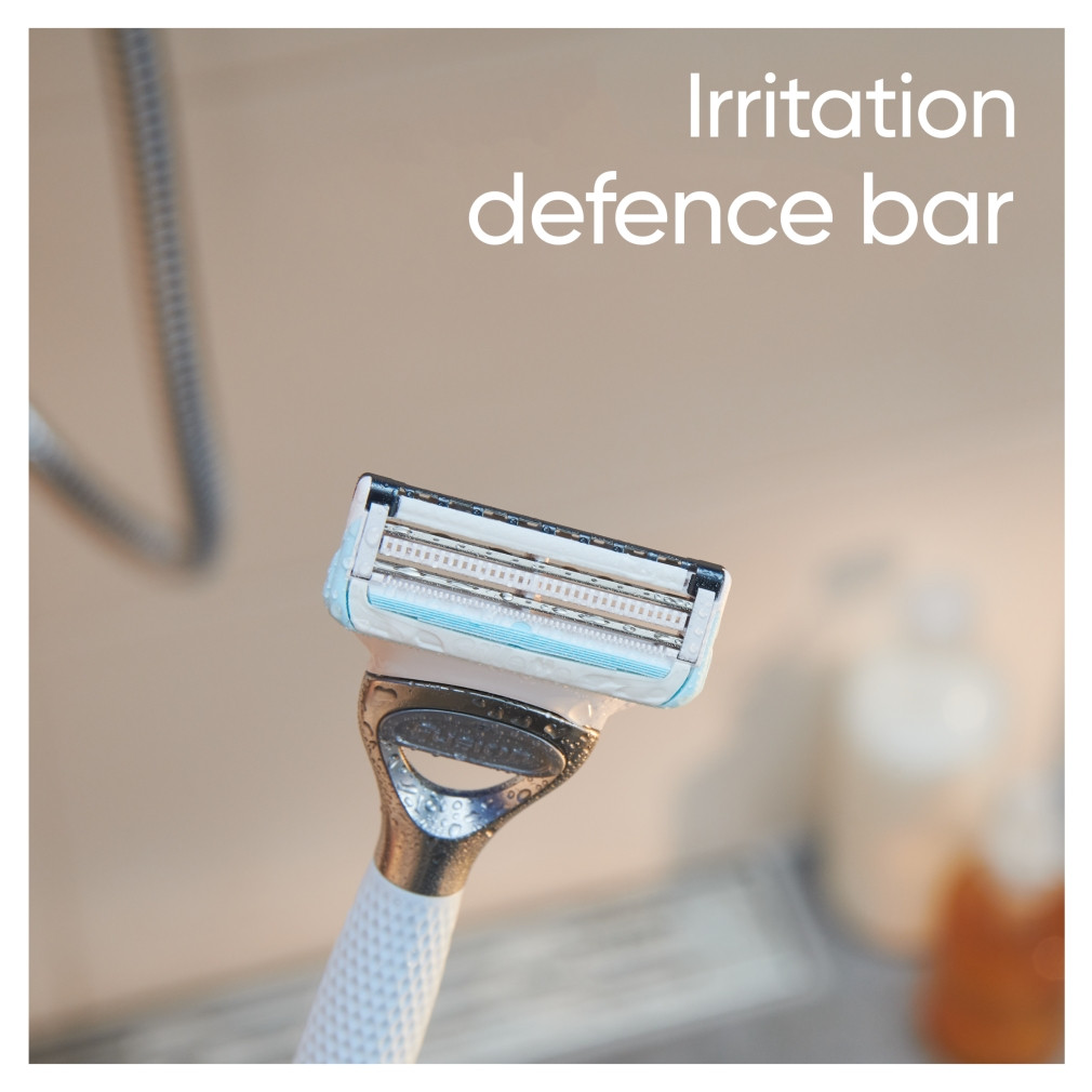 A Venus intim szőrzethez és bőrterülethez készült borotvát úgy tervezték, hogy megóvja az intim bőrt a borotválkozás utáni irritációtól. A szabadalmazott Irritation Defense Bar és az optimális távolságú pengék úgy vágják le a szőrszálakat, hogy közben alig érintik a bőrt. A borotvabetét hátoldalán precíziós nyíró található, amely segít a nehezen hozzáférhető területek elérésben.