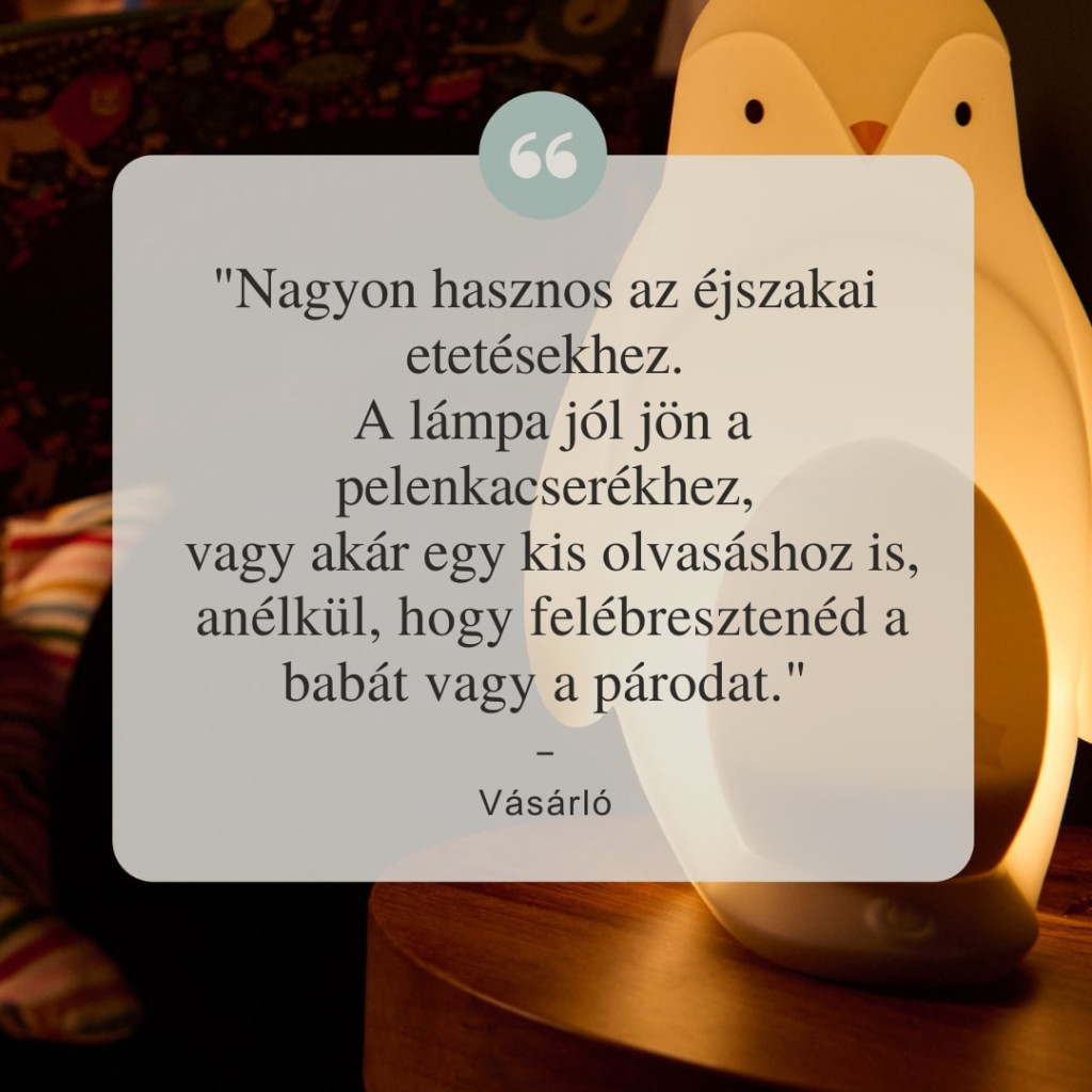 Bájos pingvin alakú USB-ről tölthető hordozható éjszakai fény. Állítható fényerősséggel, automatikus ki és bekapcsolással, elemlámpaként is használható. Halvány kellemes fénye megnyugtatja a kisbabát és biztonságérzetet nyújt számára. Szoptatás során nem kell felkapcsolnod a villanyt, így a baba nem ébred fel teljesen.