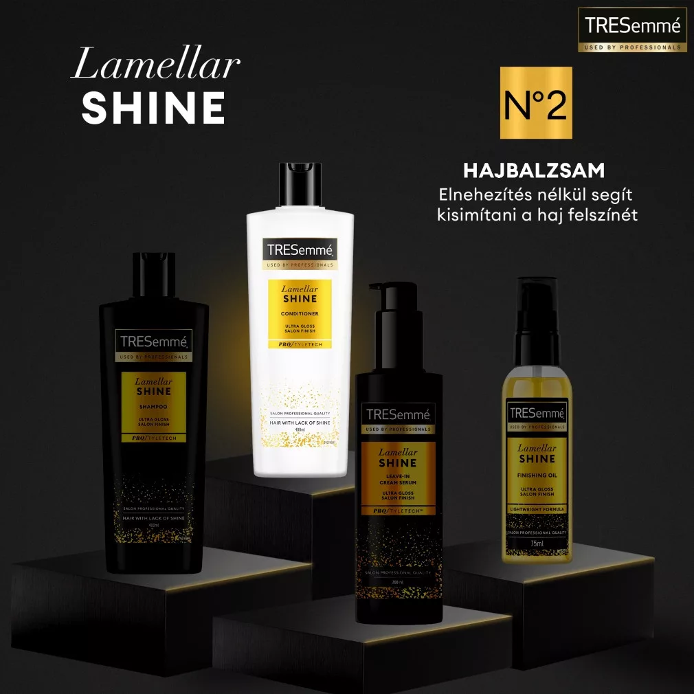 Ragyogj a TRESemmé Lamellar Shine termékcsalád erejével! Ez a különleges hajbalzsam a hajszálak felületén segít helyreállítani, simává, kezelhetővé és könnyen formázhatóvá tenni a hajat, az ultrafényes szalonminőségű eredmény elérése érdekében.