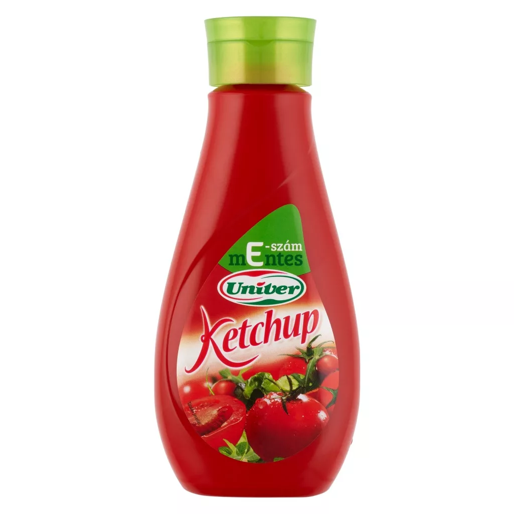 Paradicsom (sűrítményből), Cukor, Ételecet, Étkezési keményítő, Só, Fűszerkivonat, 100 g ketchupban 185 g paradicsom