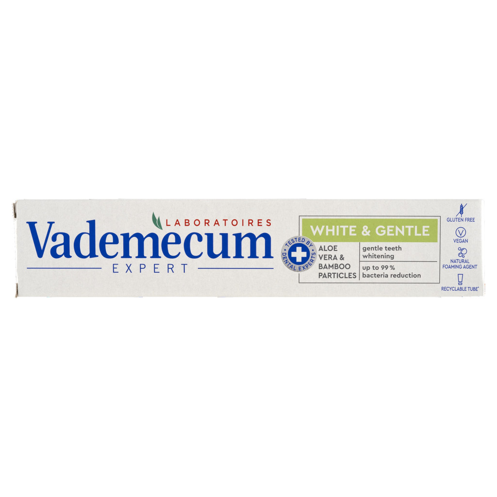 A Vademecum Expert White & Gentle fogkrém gyengéden fehéríti a fogakat, miközben csökkenti a baktériumok 99%- át. Aloe Vera és bambusz részecskékkel a gyengéd fogfehérítésért.