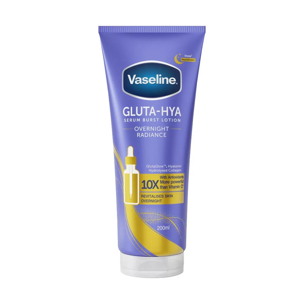 A Vaseline Overnight Radiance szérumos testápoló GlutaGlow technológiával, hialuronsavval és kollagénnel. Támogatja a bőr éjszakai regenerációját, könnyed, gyorsan beszívódó formulája feltöltődött, üde bőrérzetet hagy maga után.