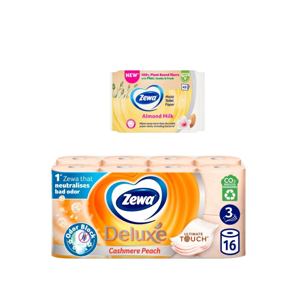 Vélemények Zewa Deluxe Cashmere Peach toalettpapír 3 rétegű (16 tekercs) + Zewa Almond Milk nedves toalettpapír (42 db)